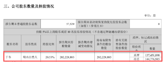 大股东质押和冻结比例高企亦加剧市场担忧。财报数据显示,截至2025年6月底,博纳影业实控人、董事长于冬已质押1.37亿股,占其持股比例约48.7%,占总股本比例约10%。