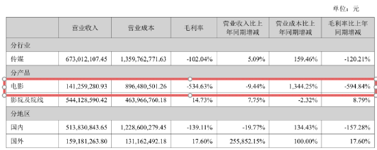 尤其是被寄予厚望的《蛟龙行动》虽然耗资巨大,却仅斩获3.93亿元的票房。这导致上半年博纳影业电影业务板块收入仅为1.41亿元,同比下降9.44%,然而在8.96亿元的高昂成本下,业务板块毛利率“断崖式”骤降至-534.63%。