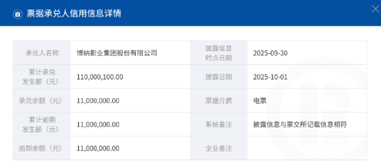 据上海票交所披露数据,截至2025年9月30日,博纳影业的电子商业汇票累计逾期发生额达1100万元,逾期余额合计1100万元。依据《商业汇票信息披露操作细则》,票交所已暂停提供商业汇票承兑服务,直至公司清偿全部逾期票据并完成信用信息披露。