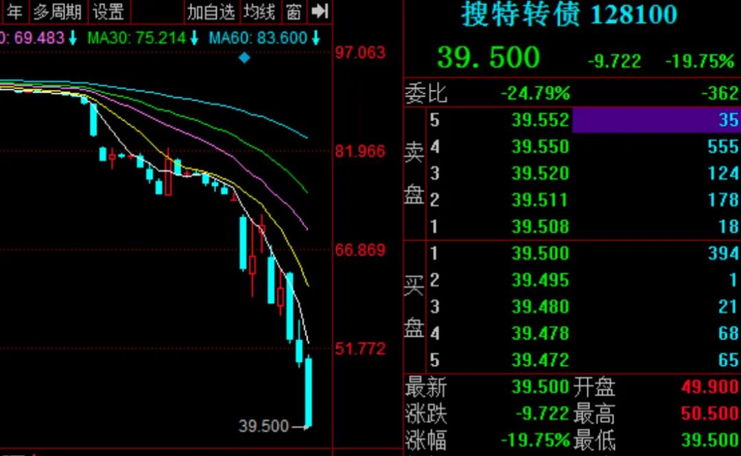 与此同时,搜特转债今日也跌超19%,创下其史上最低价39.5元。