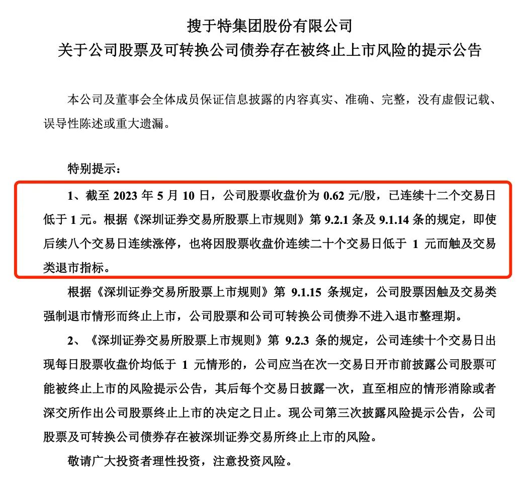 5月10日晚间,*ST搜特公告称,截至2023年5月10日,公司股票收盘价为0.62元/股,已连续12个交易日低于1元。这也意味着,即便未来8个交易日均涨停,其股价也无法重回1元,*ST搜特股票与可转债均已提前锁定退市。