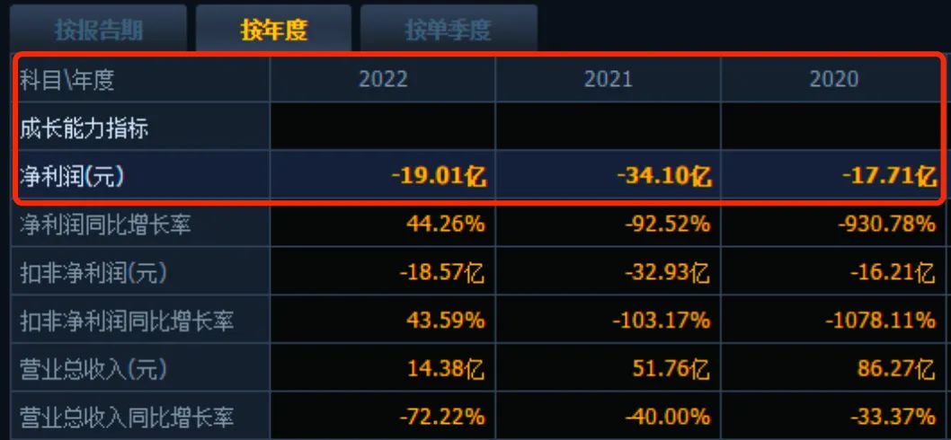 2020年至2022年,*ST搜特营收86.27亿元、51.76亿元、14.38亿元,分别下降33.37%、40%、72.22%;归母净利润连续亏损,分别为-17.71亿元、-34.10亿元、-19亿元。