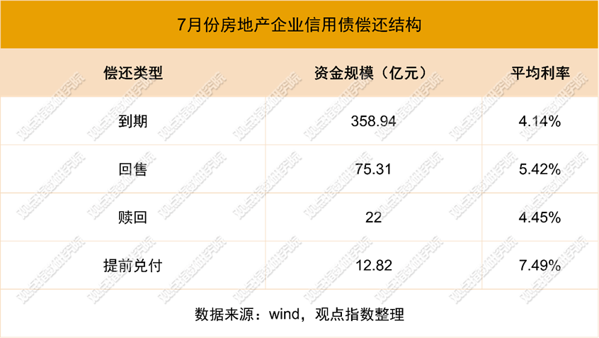 数据来源:wind,观点指数整理从7月份的偿还结构来看,到期偿还的规模最大,其次是回售规模。可以看到,回售的部分,平均利率较高,为5.45%,高于全年平均发行利率,同时赎回部分的利率也是如此。其中,提前兑付的部分平均利率最高。所以报告期内,房地产企业的主动偿还行为,能有效降低利息成本规模。