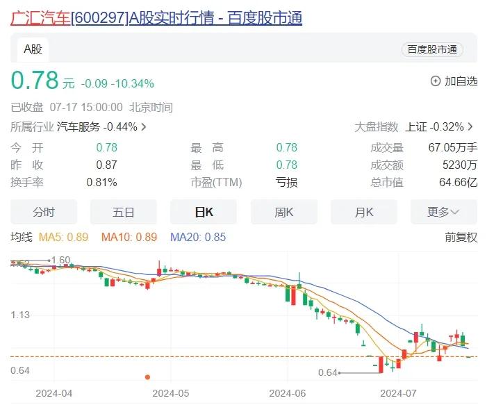 7月17日,广汇汽车开盘跌停,收盘报0.78元/股,市值64.66亿元。