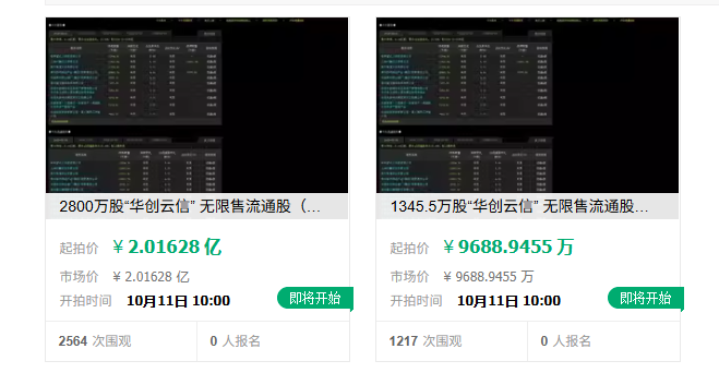 9月5日,华创云信公告称,公司股东上海杉融实业有限公司(以下简称“杉融实业”)部分股权将被司法拍卖。根据公告,此次涉及股份数量为4145.5万股,占杉融实业持股比例的34.94%,占公司总股本的1.87%。本次拍卖的4145.5万股被分为2个标的物,分别为2800万、1345.5万,前者起拍价约2.02亿元,后者起拍价约9688.95万元。本次拍卖将在淘宝网进行,拍卖起始时间是10月11日,为期一天。