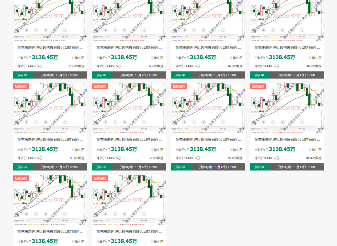 9月14日,锦龙股份公告显示,其控股股东东莞市新世纪科教拓展有限公司(下称“新世纪公司”)部分股权将被司法拍卖。根据公告,此次涉及股份数量为3000万股,占新世纪公司持股比例的17.05%,占公司总股本的3.35%。本次拍卖的3000万股被平均分为10个标的物,起拍价为3138.45万元。本次拍卖将在京东网司法拍卖网络平台上进行,拍卖时间为10月12日至10月13日。
