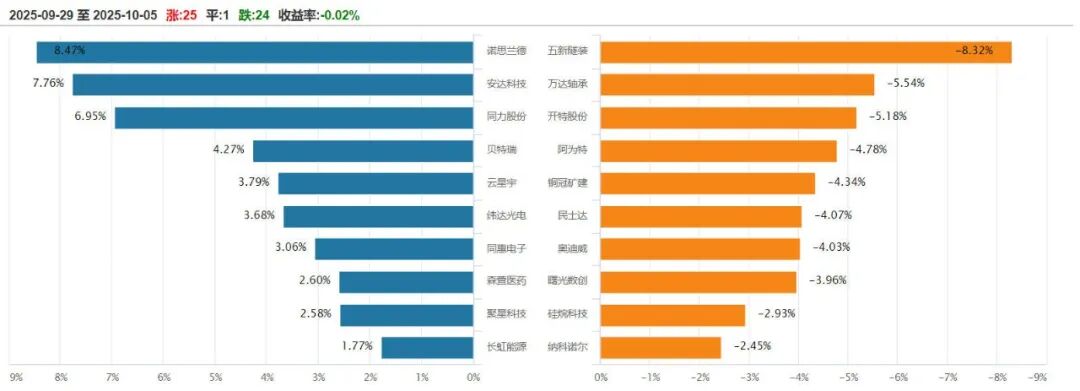 上周(9月29日-10月5日),北证50成分股中,25只上涨,1只平盘,24只下跌。