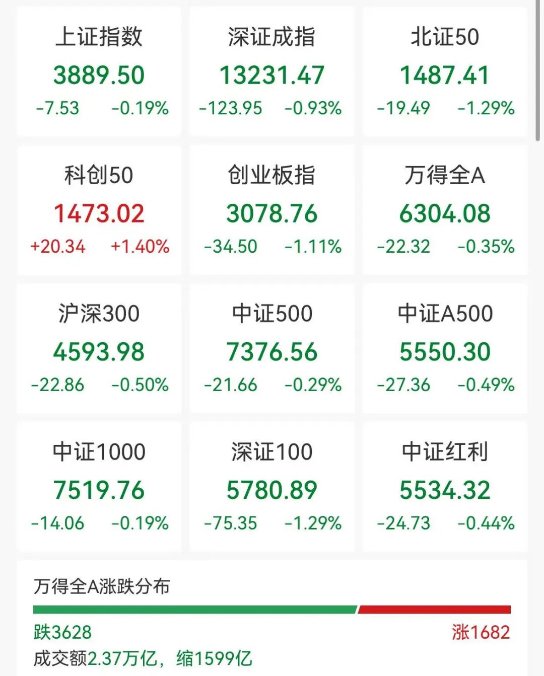 10月13日,A股市场全天震荡回升,截至收盘,沪指跌0.19%,深成指跌0.93%,创业板指跌1.11%。沪深两市成交额2.37万亿,较上一个交易日缩量1599亿。