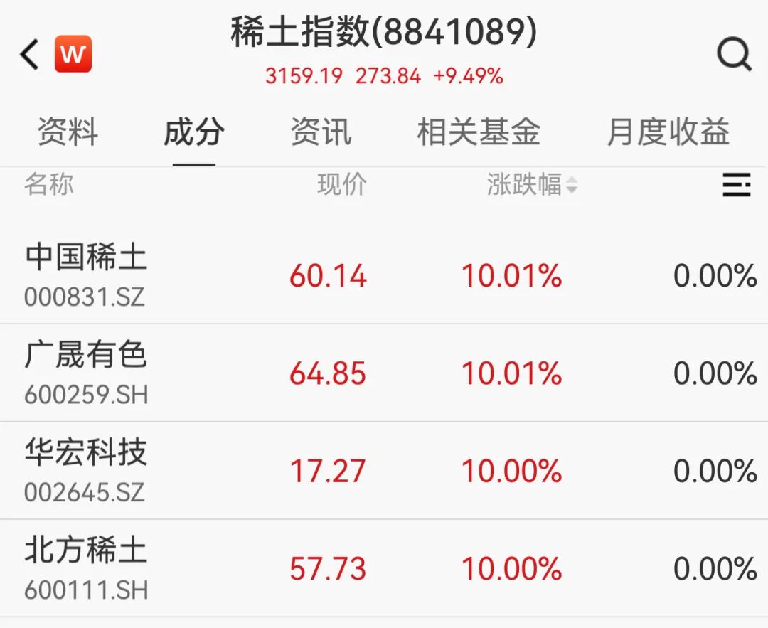 稀土板块全日走强,尾盘掀涨停潮,中国稀土等多股涨10%。