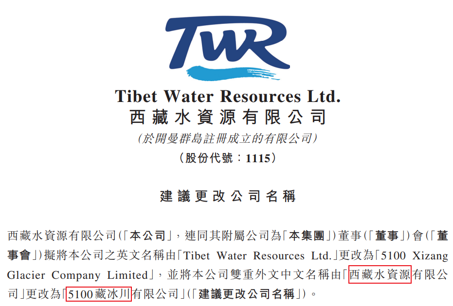 上周,5100西藏冰川矿泉水母公司西藏水资源(01115.HK)发布公告称,公司名称将从“西藏水资源有限公司”变更为“5100藏冰川有限公司”。
