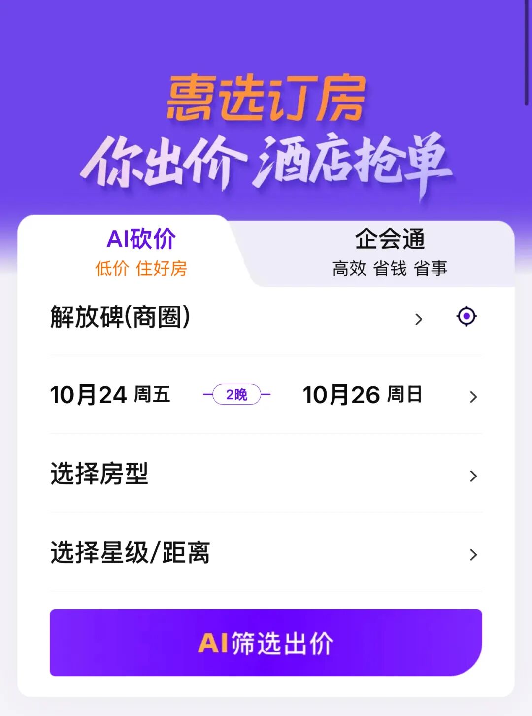 用户输入位置、房型和心理价位,AI基于实时数据生成建议价(通常为市价70%-80%),订单随即派发至附近酒店抢单,全程价格信息密闭,犹如“袖子里谈生意”。