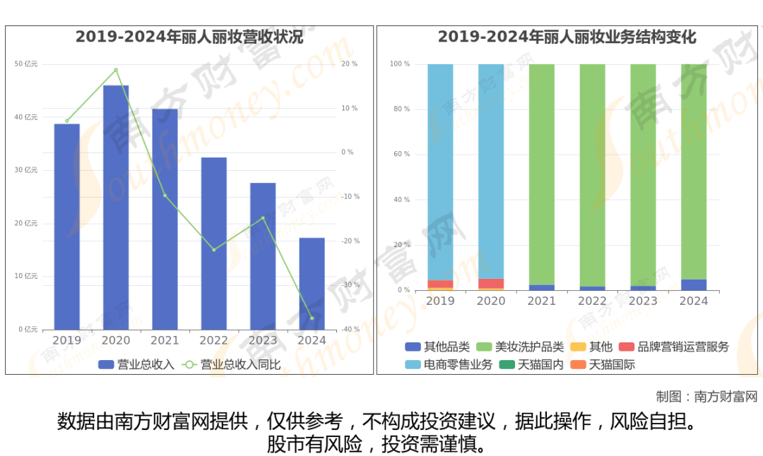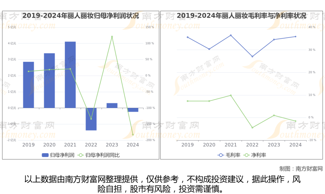 根据公司年度数据显示(如上图),2024年,丽人丽妆实现营业总收入17.28亿,同比增长-37.44%,近5年复合年增长率-21.71%。