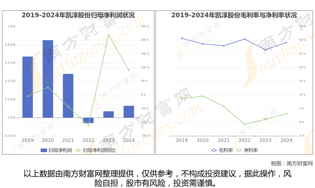数据显示(如上图),凯淳股份公司2024年营业收入4.22亿,同比增长-33.91%,近5年复合年增长率(CAGR)-16.94%。