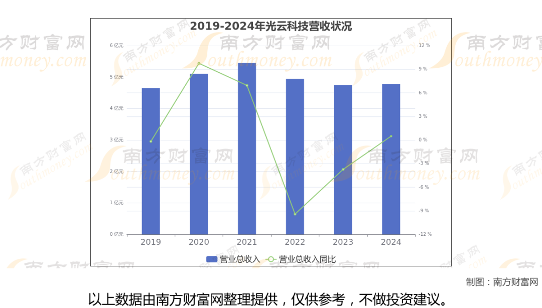 数据显示(如上图),公司2024年营业收入为4.78亿,同比增长0.49%,近5年复合增长为-1.62%。