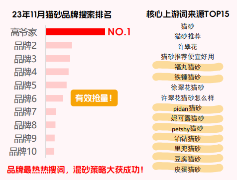 以一招“万物皆可混许翠花”的混砂策略,许翠花成功在社交媒体上打出了声量,也陆续推出了混合矿砂、混合豆腐砂等混砂产品。《小红书2024宠物行业洞察报告》显示,原本的猫砂圈新手许翠花,2023年底已经进入平台猫砂相关“核心上游词来源TOP15”。