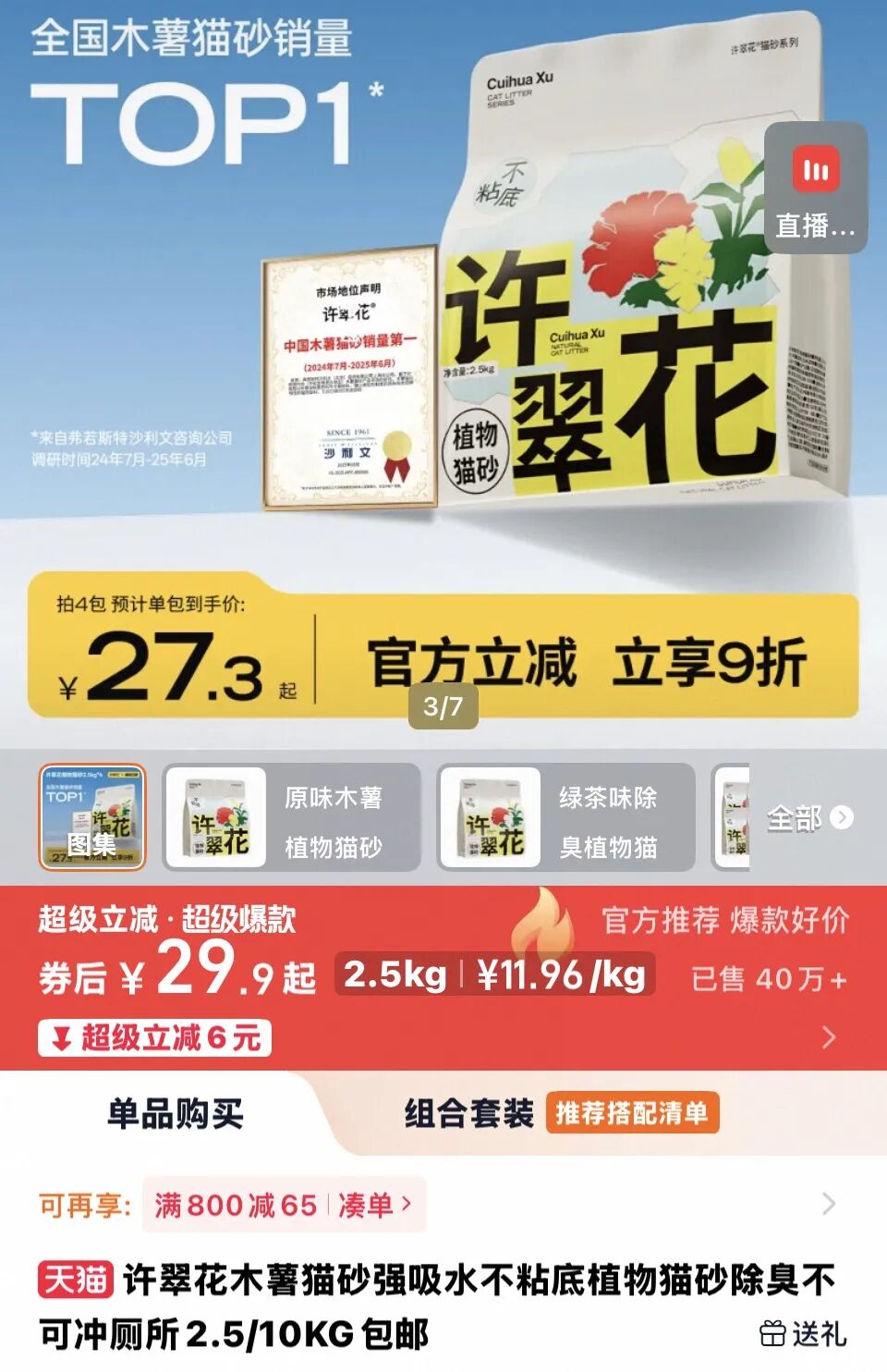2022年诞生的许翠花,到2024年销售额就已突破2.6亿元。2025年6·18大促期间,许翠花增长超过150%,在多个平台收获品类榜一;还有消息称,今年天猫“双11”现货开卖1小时,猫砂品牌“许翠花”成交额已超过去年“双11”全周期,高爷家创始人彭瀚也在公开报道中表示,计入预售部分,今年“双11”许翠花旗下大单品“木薯猫砂”已售出8000多吨。