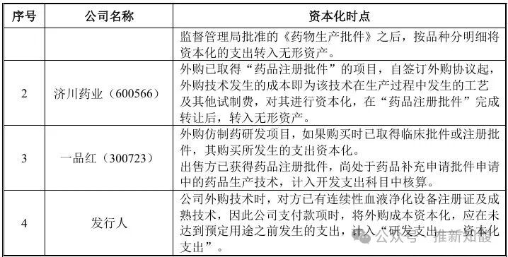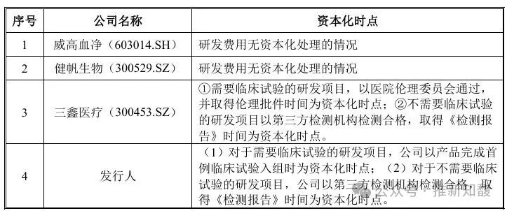 三鑫医疗为公司的直接可比公司,其中对于不需要临床试验的研发项目,公司与三鑫医疗资本化时点保持一致;对于需要临床试验的研发项目,公司以产品完成首例临床试验入组时为资本化时点,该时点晚于三鑫医疗对应的资本化时点,相关会计处理在时点判断上更为审慎,不存在资本化时点提前的情形; 健帆生物为公司的直接可比公司,其核心产品为血液灌流器,而公司资本化的研发项目主要聚焦于血液透析器、血液透析机等产品,针对血液灌流器相关研发项目未发生任何资本化账务处理,因此公司与健帆生物在同类产品研发支出均做了费用化处理,无重大差异; 威高血净为公司直接可比公司,其深耕血液净化行业多年,产品布局完善、核心产品工艺成熟,研发以现有产品的优化迭代为主,未进行研发支出资本化;公司资本化研发项目主要围绕血液透析机、药物球囊等新产品布局及注册证获取,亦包含血液透析器新工艺研发,双方因发展阶段、研发项目属性存在本质差异,进而形成资本化处理的不同,公司相关会计处理符合企业会计准则规定,且具备审慎性。
