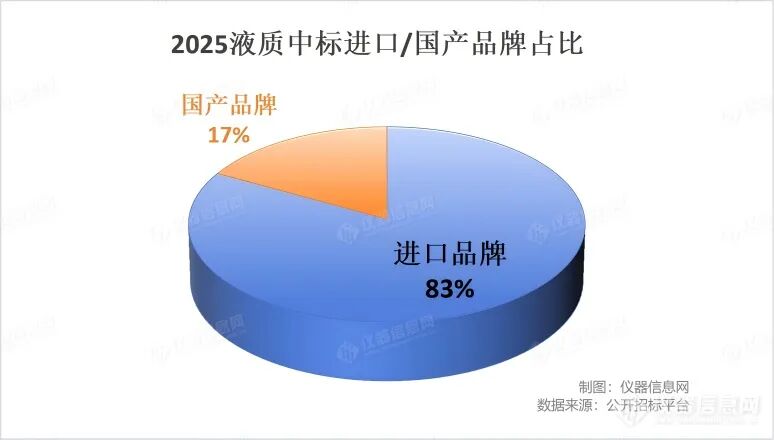 长期以来,进口品牌在质谱仪市场占据绝对主导地位,市场份额通常维持在90%左右。但2025年中标数据显示:国产品牌相较去年11%的占比来说有一个相对较明显的增长趋势,达到了17%。可见在国产替代浪潮下,国产品牌乘着政策红利的东风不断地发展,在性能优化和市场用户信任度做到了崛起。同时,2025年9月国务院进一步明确国产仪器界定标准,并强化本国产品采购支持,减少了此前“国产标准模糊”带来的市场不确定性,提升了采购信心。