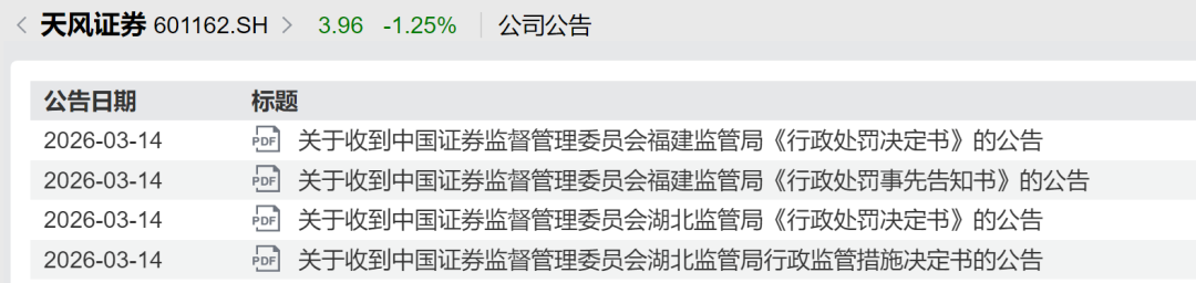 3月13日盘后,天风证券(维权)(601162.SH)多张罚单落地。根据公告,天风证券当日收到来自湖北证监局、福建证监局以及上交所的多份行政处罚及行政监管措施决定书,合计罚款金额超过4000万元,部分业务资质被暂停。