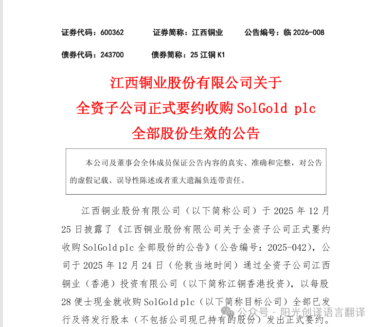 这场备受行业关注的跨境并购,始于2025年12月,前后历时3个月,期间波折不断。江铜最初通过全资子公司江西铜业(香港)投资有限公司发起收购要约,先后两次以每股26便士的价格报价,均被SolGold董事会拒绝,收购进程一度陷入停滞。