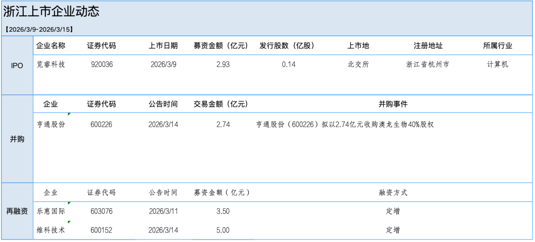 上周,全国6家企业向发审委提交首发申请,6家过会,其中1家浙江省内企业;1家浙江公司发布并购重组公告,2家浙江公司发布再融资公告。3月12日,浙江信胜科技股份有限公司通过北交所审核。