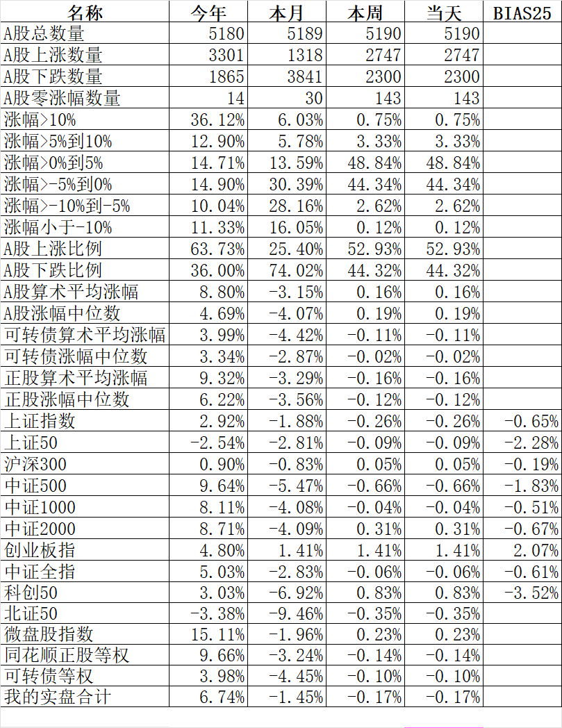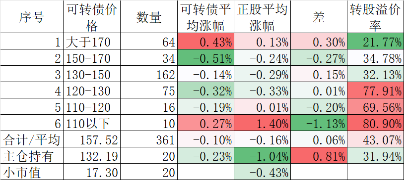 361只可转债平均下跌0.10%,对应正股平均下跌0.16%。我的主仓20只可转债平均下跌0.23%,对应正股平均下跌1.04%。
