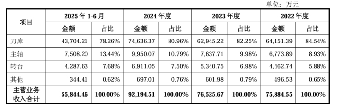 公司报告期内主营业务收入来自刀库产品,收入占比在80%左右。报告期内,冈田智能主营业务收入分别为7.59亿元、7.65亿元、9.22亿元、5.58亿元。其中,刀库的收入分别为6.42亿元、6.29亿元、7.46亿元、4.37亿元,占主营业务收入的比例分别为84.54%、82.25%、80.96%、78.26%。