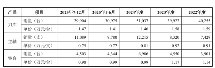 下游方面,数控机床行业竞争加剧导致客户产品价格下降。招股书显示,报告期内公司主要产品售价均呈下降趋势。刀库产品售价从2022年的1.59万元/台降至2025年1-6月的1.41万元/台,主轴产品从0.91万元/支降至0.77万元/支,转台产品从1.14万元/台降至0.99万元/台,价格下行趋势贯穿报告期始终。