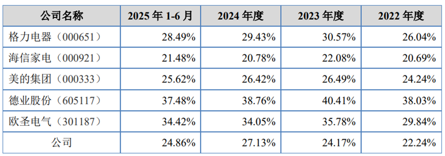 从规模量级来看,欧伦电气 2024 年营收仅 16.23 亿元,和欧圣电气同为十亿级企业,而德业股份是百亿级企业,美的、格力、海信同期营收分别高达 4071.50 亿元、1891.64 亿元、927.46 亿元,是千亿巨头,体量相差超 50 倍至 250 倍,二者在毛利率、费用率、研发强度、净利率等核心财务指标的形成逻辑完全不同,是否具备任何对标分析意义存在疑问,将构成典型的审核问询高发问题。