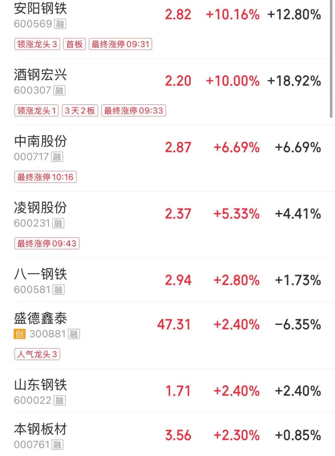 钢铁板块异动拉升,安阳钢铁、法尔胜、酒钢宏兴纷纷涨停,中南股份、凌钢股份、八一钢铁(维权)等跟涨。