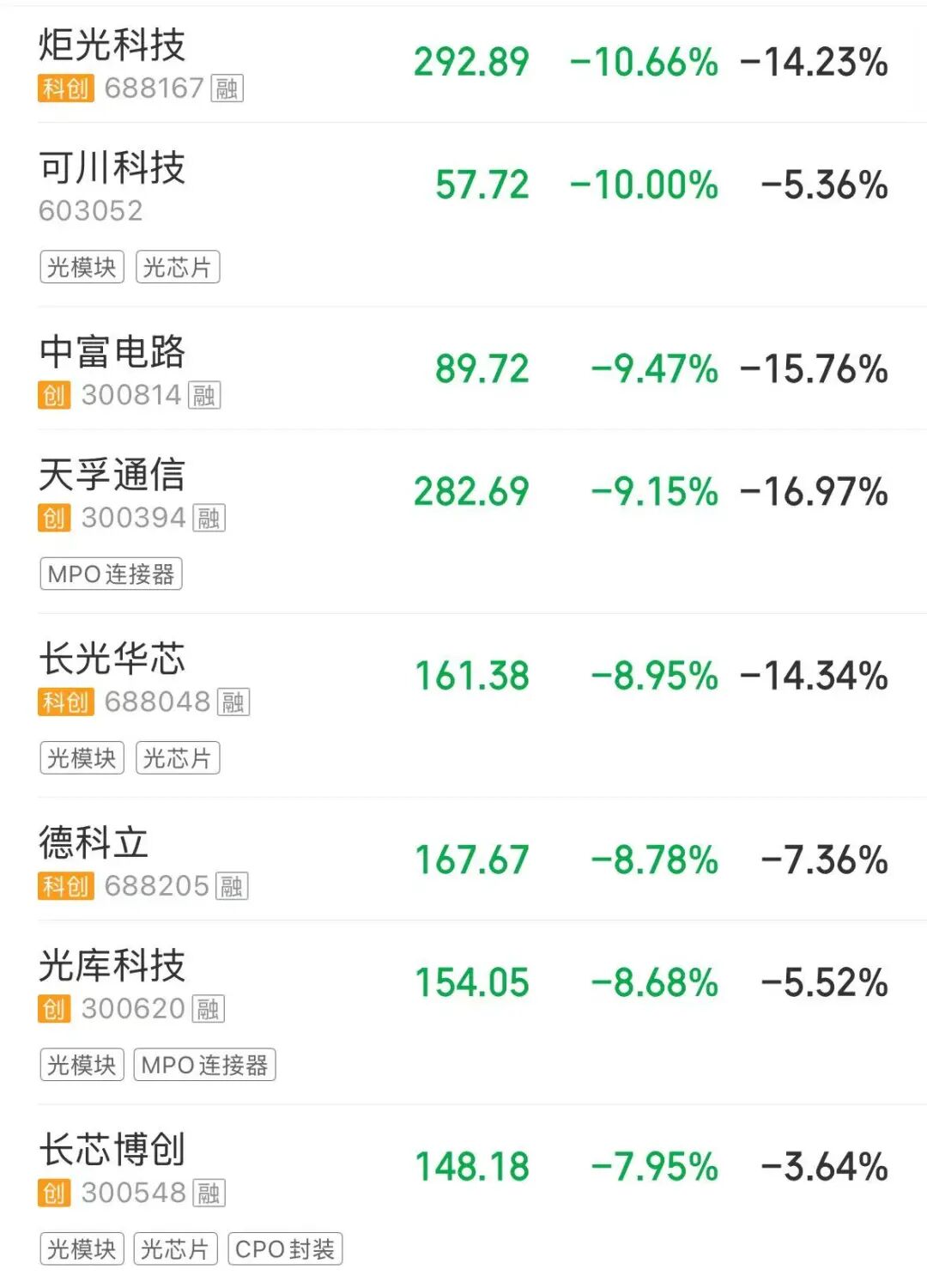 下跌方面,科技股回调,算力产业链领跌,光模块、光纤等板块大跌,这可能与部分资金“利好兑现”有关。CPO概念震荡走弱,天孚通信、光库科技等多股大跌。