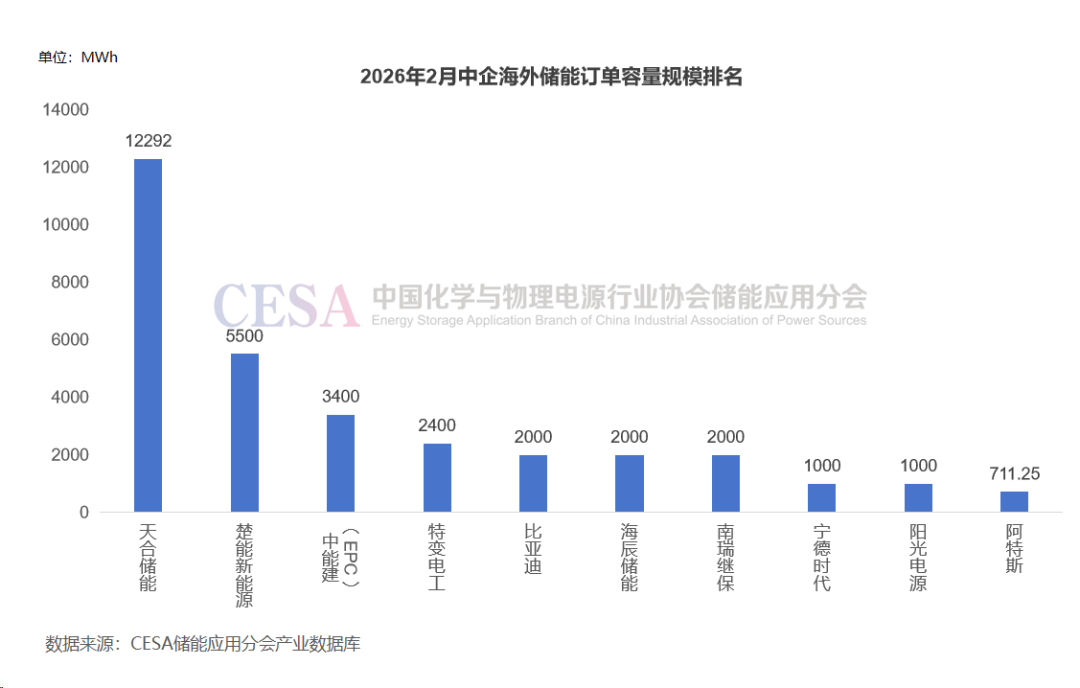 据CESA储能应用分会产业数据库不完全统计,2026年2月,中国企业在海外共斩获30个储能订单,总计容量为35.71GWh。从订单类型来看,明确提及供给或采购储能电池/储能系统的订单有25起,EPC总承包合同有4起,合作协议1起。