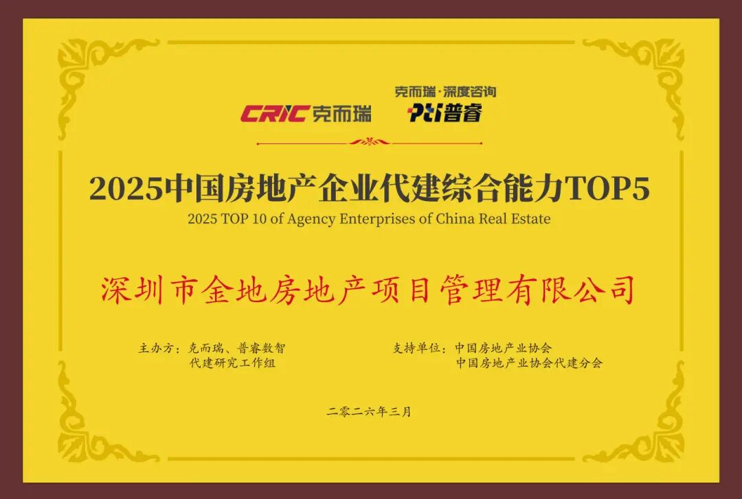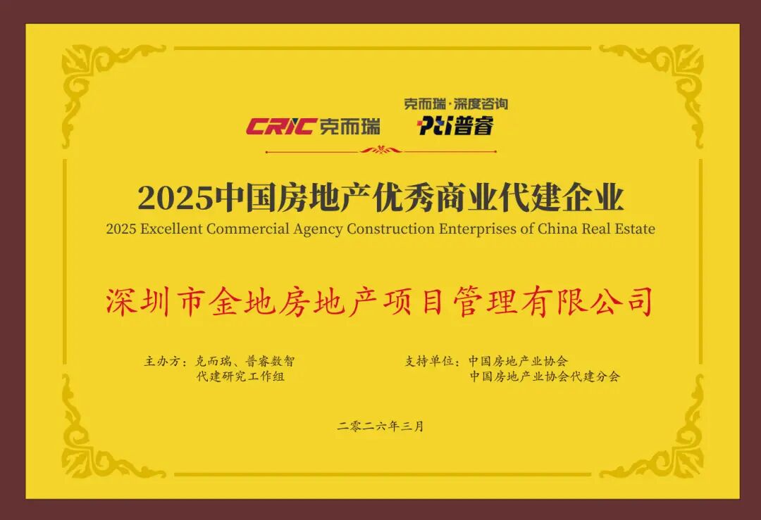 会上,《2026中国房地产综合实力TOP500研究系列成果》发布,金地管理凭借不断积累的代建实力和品牌价值位列“2025中国房地产企业代建综合能力TOP5”,同时还获得了“2025中国房地产优秀商业代建企业”、“2025中国房地产优秀资本代建企业”,其代建项目“深信服科技大厦”荣获“2025年全国十大优秀代建项目”殊荣。