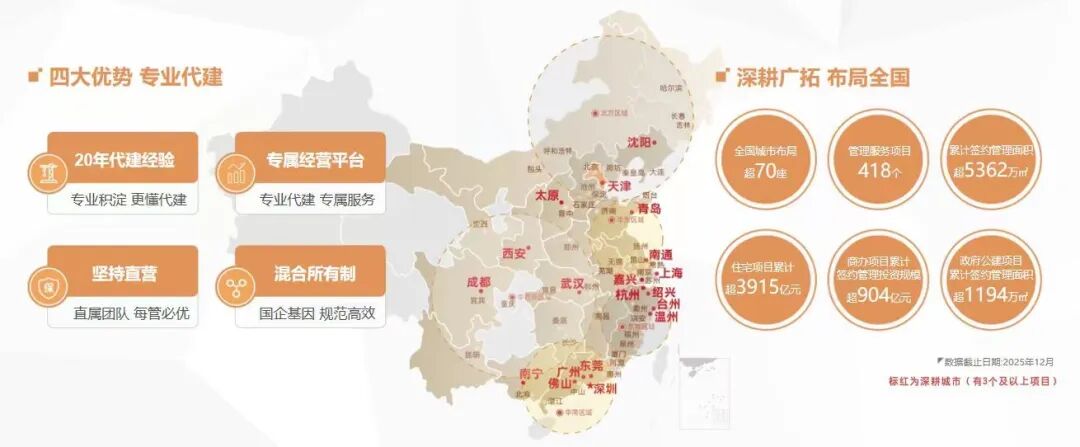 2025年,金地管理持续夯实以“产品+服务+经营”为核心的能力建设,强化体系赋能与经营管控,以更灵活的合作模式和更多元的服务内容积极应对市场变化。截至2025年12月,金地代建业务实现累计签约管理面积超过5362万平方米,同比增长40%;住宅项目累计签约货值超3915亿元,同比增长22%;商办项目累计签约管理投资规模达904亿元,政府代建规模超1194万平方米。