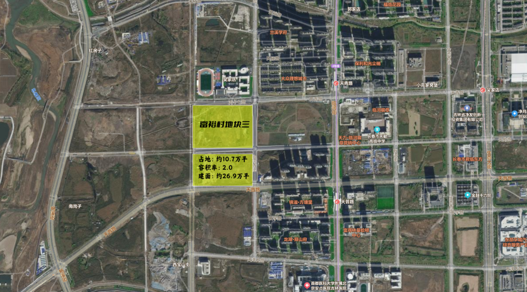 富裕村地块三(商品房项目)位于南关区滨河东路以东、天青路以南、河西路以西、天勤路(天普路)以北。项目总用地面积为106532.05㎡,容积率2.0,规划总建筑面积268521.74㎡。