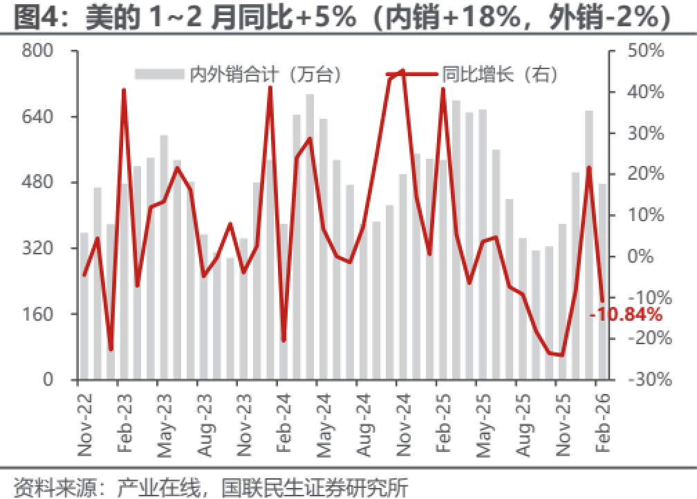 1~2月空调外销同比-4%,25Q4为同比-19%,高基数上降幅收窄,亦好于排产预期。后续,3/4月空调外销排产分别同比-7%/+3%,2025年同期基数分别为+15%/持平,随压力减轻,有望逐月改善,一阶拐点渐近。近期美国关税司法多有波折,压力减轻或为基调,中东市场及航运不确定性仍高;冰洗外销修复趋势逐步确立,1~2月海关口径家电出口量同比+16%,地缘影响若无超预期演化,空调有望在消化基数后,向中高个位数历史中枢收敛;龙头25Q3~Q4外销接单持续好转,筑底修复阶段,有望好于线性预期。