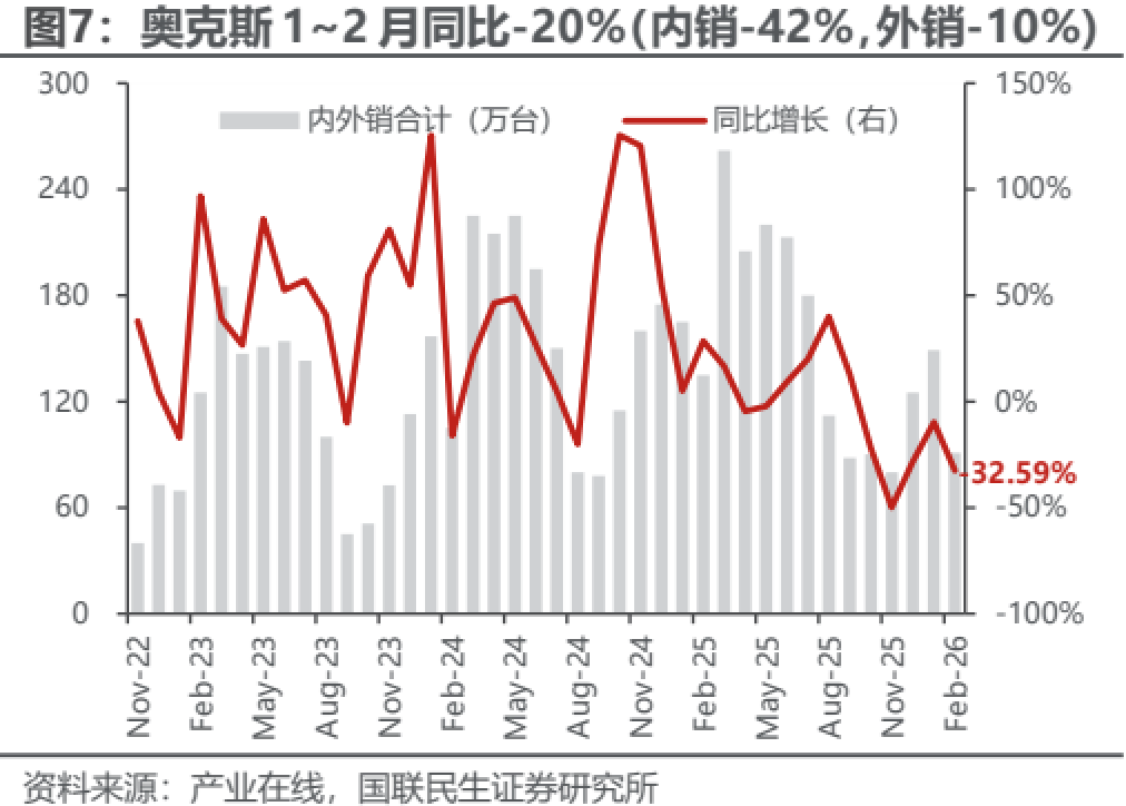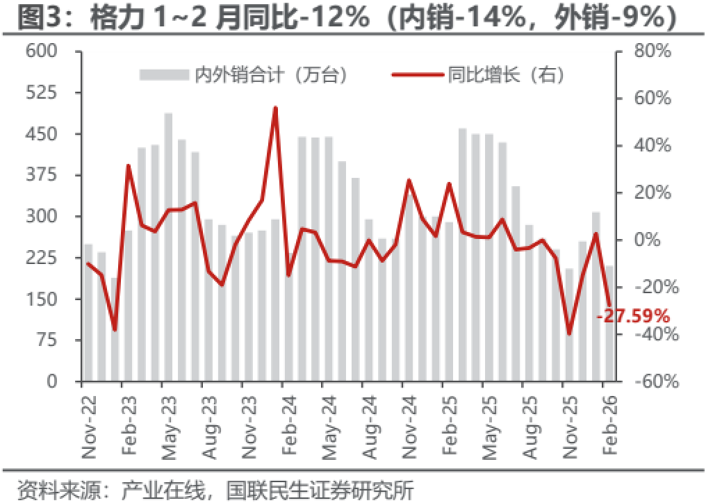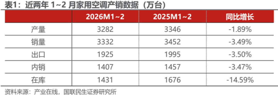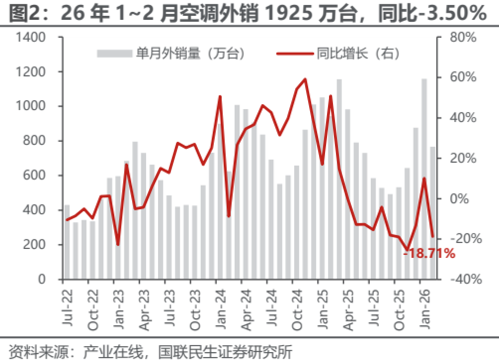 1~2月空调内销出货同比-3%,好于25Q4(-29%)及此前排产预期(-12%)。从基数看,2024Q4及2025年1~2月空调内销出货分别同比+24%/+9%,压力减轻,叠加2026年初补贴延续较早,带动内销改善;剔除基数看,1~2月内销较无政策扰动的2024年同期CAGR约为+2%,而2025Q4两年CAGR约为-6%,环比回正,平稳增长。终端方面,1~2月龙头安装卡双位数增长,印证需求好转;据产业在线排产指引,3/4月内销将分别同比-2%/+2%,趋势平稳向上,且1~2月内销实绩均高于此前排产预期,改善有望延续。