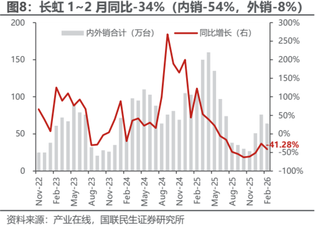 1~2月产量3,282万台,同比-1.89%,销量3,332万台,同比-3.49%,其中内销1,407万台,同比-3.47%,出口1,925万台,同比-3.50%,期末库存1,431万台,同比-14.59%;分厂商销量,格力同比-12.20%(内销-14.44%,出口-8.70%);美的同比+5.50%(内销+18.07%,出口-2.43%);海尔同比-4.11%(内销+12.99%,出口-25.90%);海信同比+4.70%(内销+28.57%,出口-5.80%);长虹同比-33.96%(其中内销-54.17%,出口-7.61%)。