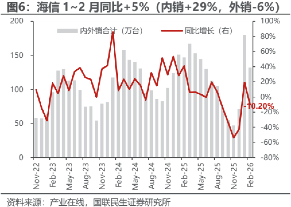 1~2月美的/格力/海尔空调内销量分别同比+18%/-14%/+13%,海信/长虹/奥克斯分别+29%/-54%/-42%,龙头多好于二线。1~2月美的内销出货量份额同比+6pct,带动内销出货CR2同比+4pct,连续3个月同比提升;海尔增势延续,1~2月内销出货量份额同比+2pct,持续向上。二线中,除海信年初以来表现较好,长虹/奥克斯/TCL出货份额均同比下降。零售端,龙头1~2月安装卡表现好于行业监测数据;格力系晶弘继续贡献增量,线上零售量份额同比+8pct。后续,成本上涨+需求弱平稳环境中,格局展望可适当积极。