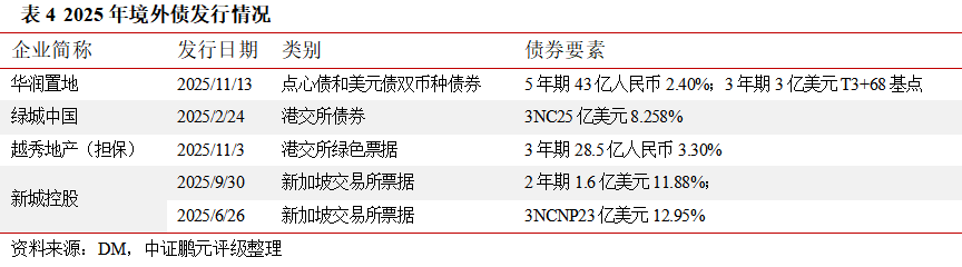 境外债重组大规模落地,优质主体境外发行破冰。2025年地产境外债发行801.50亿美元,净融资395.77亿美元,净融资大幅增长主因2025年有多家地产公司境外债务重组取得进展,如融创中国、旭辉控股、碧桂园等。除重组债务外,2025年华润置地、绿城中国、新城控股等陆续重启境外债融资,主要用于置换现有债务;需要注意的是,境外债务融资成本仍偏高,需关注相关企业融资成本变化情况。随着出险房企境外债重组陆续推进、境外融资渠道破冰,预计2026年境外债融资仍将持续修复,优质主体有望通过境外债券再融资偿还存量债务。