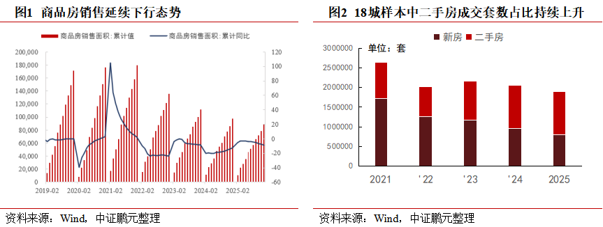 与此同时,二手房市场延续“以价换量”的态势,交易占比进一步提升。根据克而瑞数据,2025年全国30个重点城市住房总成交面积为3.26亿平方米,同比下降7%;其中,新房成交面积1.16亿平方米,同比下滑18%;而二手房成交面积达2.14亿平方米,同比微增0.2%,创2021年以来新高,二手房成交面积占重点城市住房总成交比重首次突破60%。根据中证鹏元统计的18个样本城市二手房成交套数来看,新房成交套数持续萎缩,二手房则凭借“以价换量”实现成交套数稳步增长。从18城总量数据来看,新房+二手房总需求跌幅收窄,总体需求较为稳定。
