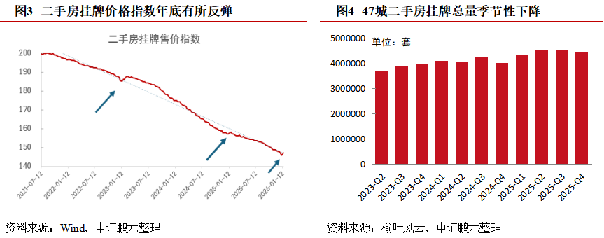 然而,当前尚难断言市场已实质性回暖。二手房作为关键的先行指标,其成交面积的变化仍需结合季节性因素审慎判断——近年来每年跨年期间通常都会出现阶段性反弹行情(见图6),且年末二手房挂牌量存在一定的季节性回落。因此,春节后“小阳春”的成色和持续性将成为验证市场是否实质性回暖的重要观察窗口。若后续政策支持力度加码,包括进一步优化限购限贷、降低交易税费、扩大“以旧换新”支持范围、加快存量房收储作保障房等举措落地见效,将有望显著加速市场筑底进程。