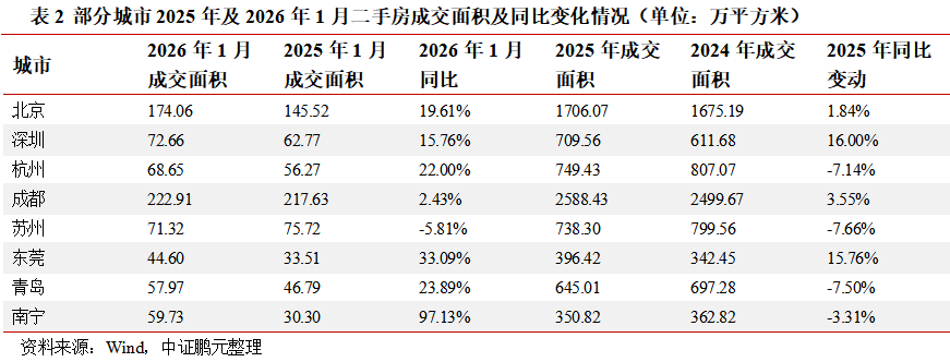 2026年房地产市场预期有望改善,春节后的小阳春成色——二手房成交量、价格指数及挂盘量是重要的观察指标。房地产市场企稳通常遵循“量在价先”的明确顺序:即先有成交量回升,随后库存去化加快,最终推动价格企稳。2025年底,房地产市场显现出季节性止跌的迹象——二手房价格跌幅明显收窄,市场成交活跃度有所回升;主要城市的二手房新增挂牌量及存量挂牌规模已趋于回落,反映出短期供应压力有所缓解,市场预期出现边际改善。进入2026年,多项积极信号初现端倪:重点城市二手房成交量有所回升,部分区域价格跌幅收窄,同时挂牌量连续数月回落,显示出供需关系正趋于再平衡。