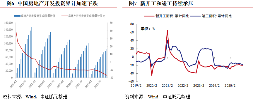 2025年政策效果尚未有效向投资端传导,终端需求复苏乏力,房企普遍拿地谨慎聚焦、开工动力不足,导致投资力度进一步削弱。2025年完成房地产开发投资额8.28万亿,同比降幅为扩大至17.2%。预计2026年房地产投资增速下行压力仍然较大,但随着保障性住房和城中村改造等政策推进落地,开发投资将有一定支撑,同比降幅有望收敛至9%-12%。
