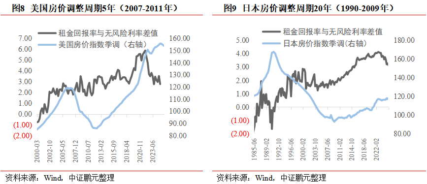 历史经验印证了这一逻辑。日本住宅价格在1988年四季度见顶后,持续下跌近20年,至2006年最大跌幅达67%;美国则在2006年一季度见顶后,受次贷危机冲击,房价连续下跌5年,至2011年四季度最大跌幅为31%。值得注意的是,两国房价企稳的关键拐点均出现在租售比(即租金回报率)显著高于无风险利率之时:日本在租售比回升至十年期国债收益率以上约2个百分点后,房价开始止跌;美国亦呈现类似规律——当租售比显著高于十年期国债收益率时,市场触底回升。