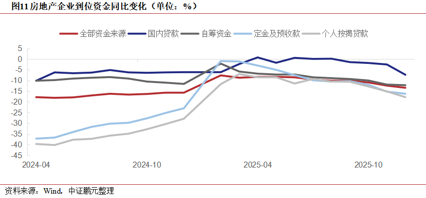 2025年房企到位资金跌幅收窄,现金流有所改善。国内贷款到位资金同比减少7.3%,或与融资政策、白名单制度、企业主动调整债务结构等相关;定金及预收款、个人按揭贷款表现仍不佳,居民加杠杆意愿不强。预计2026年随着销售降幅收窄、融资支持政策进一步落地,房企到位资金有望企稳。