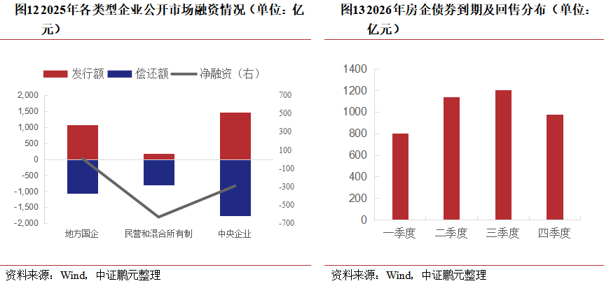 2026年境内债券到期及行权债券余额4,125.32亿元,较2025年到期及回售规模有所下降。其中民营及混合所有制企业到期及回售规模合计1,350.23亿元,但主要为已出险房企债务到期,龙湖集团、金地集团、滨江集团等整体偿付压力可控;需关注万科集团2026年仍有123.66亿元债券待兑付,主要集中在第二、第三季度,需持续关注债券展期相关事宜推进情况。