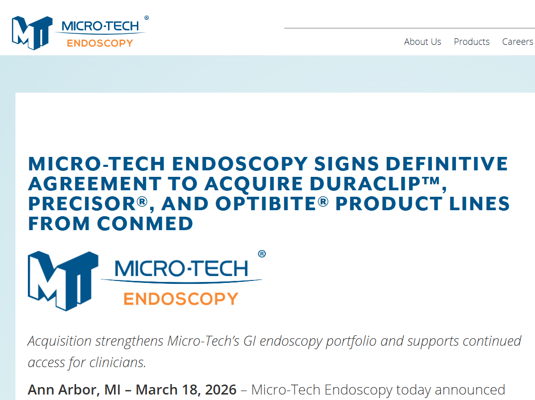 2026年3月18日,南微医学宣布其美国子公司与纽交所上市公司CONMED Corporation(股票代码:CNMD,下称“CONMED”)达成资产交易协议,计划收购CONMED旗下Duraclip™、Precisor®和Optibite®三大产品线。