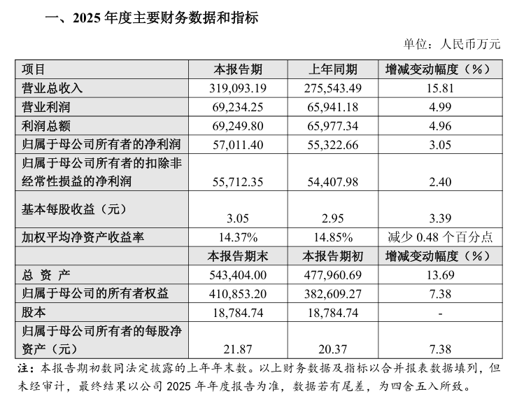 根据南微医学2025年度业绩预告,2025 年,公司实现收入和利润历史新高。报告期内,公司实现营业总收入319,093.19万元,较上年 同期增长15.81 %;归属于母公司所有者的净利润57,011.40万元,较上年同期 增长3.05%;归属于母公司所有者的扣除非经常性损益的净利润55,712.35万元, 较上年同期增长2.40%。报告期末,公司财务状况良好,总资产543,404.00万 元,较报告期初增长13.69%;归属于母公司的所有者权益410,853.20万元,较 报告期初增长7.38%。