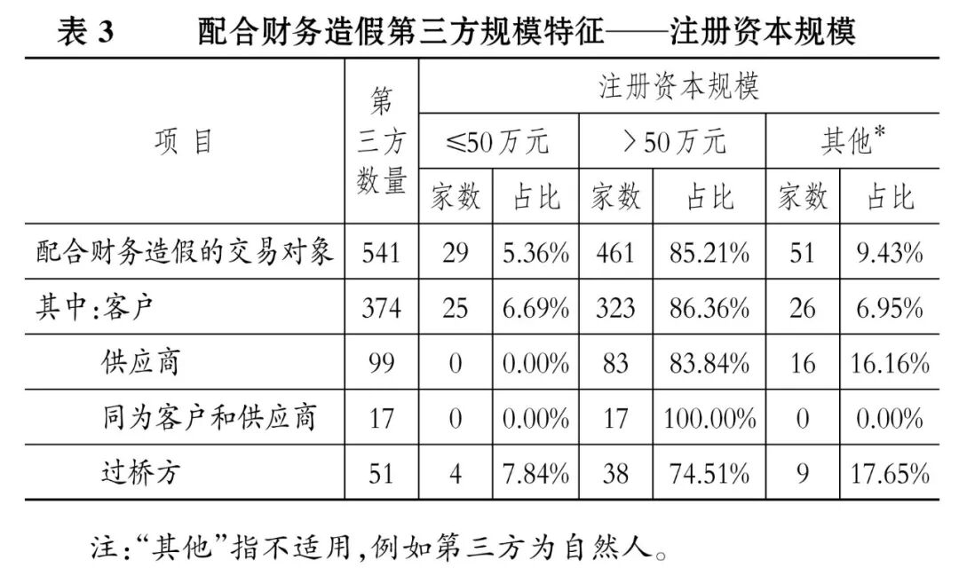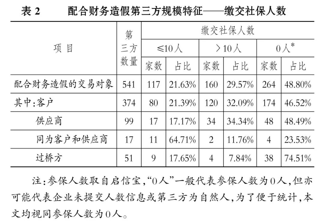 2. 配合财务造假第三方的规模分布。表2和表3分别从缴交社保人数、注册资本规模两个角度,列示了配合财务造假第三方的规模特征。